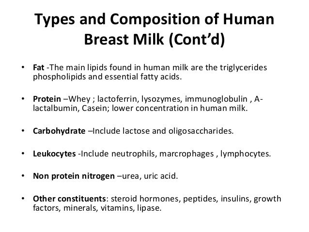 - 9. Types and Composition of Human Breast Milk• Types of Breast Milk: 1. Colostrum or Early Milk 2. Transitional Milk 3. Mature Milk• Colostrum or Early Milk is produced in the late stage of pregnancy till 4 days after delivery; and is rich in antibodies.• Transitional Milk produced from day 4 –10 is lower in protein in comparison to Colostrum.• Mature milk is produced from approximately ten days after delivery up until the termination of the breastfeeding.