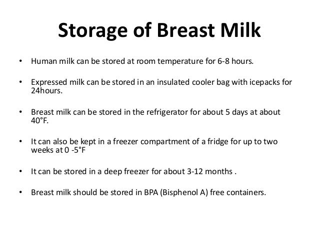 orage of Breast Milk• Human milk can be stored at room temperature for 6-8 hours.• Expressed milk can be stored in an insulated cooler bag with icepacks for 24hours.• Breast milk can be stored in the refrigerator for about 5 days at about 40°F.• It can also be kept in a freezer compartment of a fridge for up to two weeks at 0 -5°F• It can be stored in a deep freezer for about 3-12 months .• Breast milks hould be stored in BPA (Bisphenol A)FREc on ta iners.- 12A