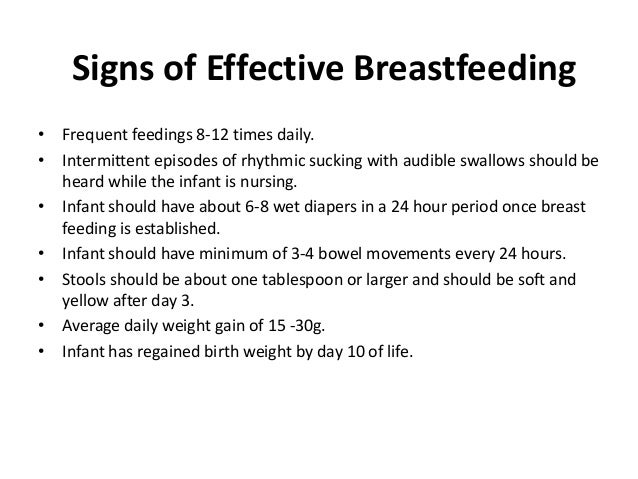 breas t milk is produced.• Lactation specialist should also work with parents that are having difficulty with breast feeding.• Early follow up after leaving the hospital is required. - 14. Signs of Effective Breastfeeding• Frequent feedings 8-12 times daily.• Intermittent episodes of rhythmic sucking with audible swallows should be heard while the infant is nursing.• Infant should have about 6-8 wet diapers in a 24 hour period once breast feeding is established.