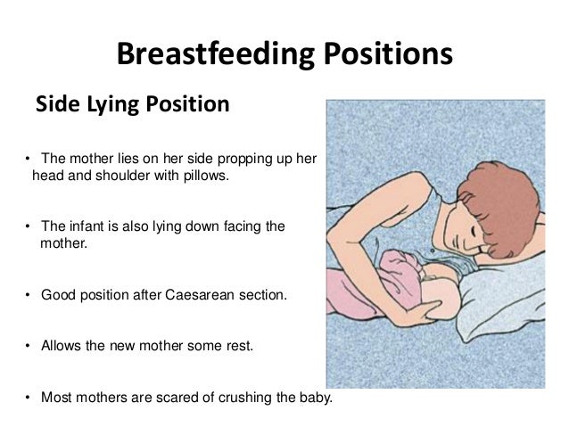 The mother li es on her side propping up her head and shoulder with pillows.• The infant is also lying down facing the mother.• Good position after Caesarean section.• Allows the new mother some rest.• Most mothers are scared of crushing the baby. - 20. Breastfeeding PositionsCross Cradle Hold Position• Ideal for early breastfeeding.• Mother holds the baby crosswise in the crook of the arm opposite the breast the infant is to be fed.• The babys trunk and head are suppo