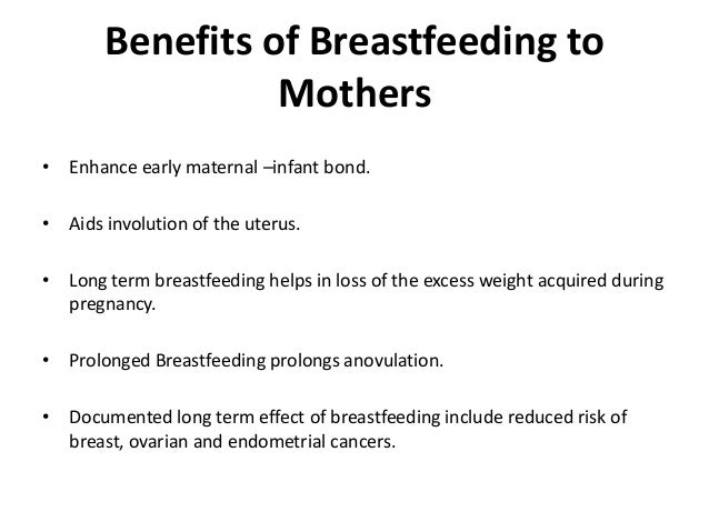 .• Aids involution of the uterus.• Long term breastfeeding helps in loss of the excess weight acquired during pregnancy.• Prolonged Breastfeeding prolongs anovulation.• Documented long term effect of breastfeeding include reduced risk of breast, ovarian and endometrial cancers.