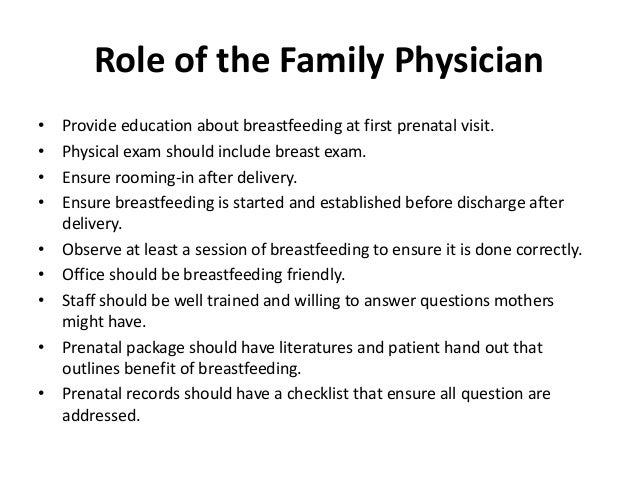 fo r Supplementation• Birth weight < 1500 g or GA < 32 weeks.• Severe hypoglycemia.• Acute water loss.• Hyperbilirubinemia related to poor intake.• Delayed bowel movement or dark stools at day 5.• Delayed milk production.• Weight loss >8% of birth weight. - 29. Role of the Family Physician• Provide education about breastfeeding at first prenatal visit.• Physical exam should include breast exam.• Ensure rooming-in after delivery.• Ensure breastfeeding is started and established before discharge after delivery.• Observe at least a session of breastfeeding to ensure it is done correctly.• Office should be breastfeeding friendly.• Staff should be well trained and willing to answer questions mothers might have.• Prenatal package should have literatures and patient hand out that outlines benefit of breastfeeding.• Prenatal records should have a checklist that ensure all question are addressed.