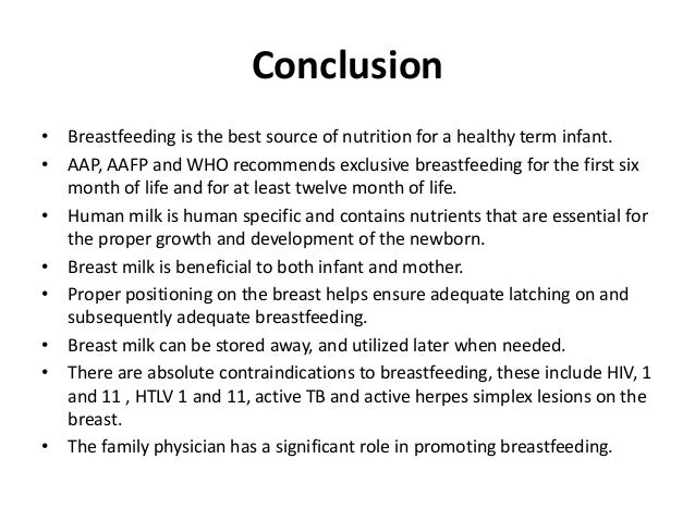 - 30. Conclusion• Breastfeeding is the best source of nutrition for a healthy term infant.• AAP, AAFP and WHO recommends exclusive breastfeeding for the first six month of life and for at least twelve month of life.• Human milk is human specific and contains nutrients that are essential for the proper growth and development of the newborn.• Breast milk is beneficial to both infant and mother.• Proper positioning on the breast helps ensure adequate latching on and subsequently adequate breastfeeding.• Breast milk can be stored away, and utilized later when needed.• There are absolute contraindications to breastfeeding, these include HIV, 1 and 11 , HTLV 1 and 11, active TB and active herpes simplex lesions on the breast.• The family physician has a significant role inPROMOTING